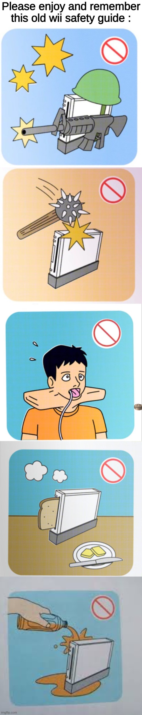 · your wii runs on electricity, not juice. Here's some tipps what not! The japanese wii manual is known to have some weird graphics indicating not to do with your wii console and its packaging. See the battery leakage warning in health and safety information (p 4) for . Wii safety manual · the wiimote is not a weapon!
